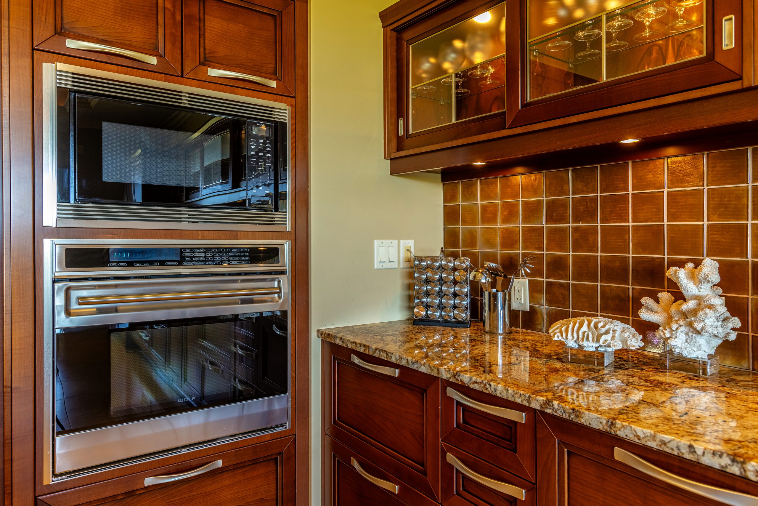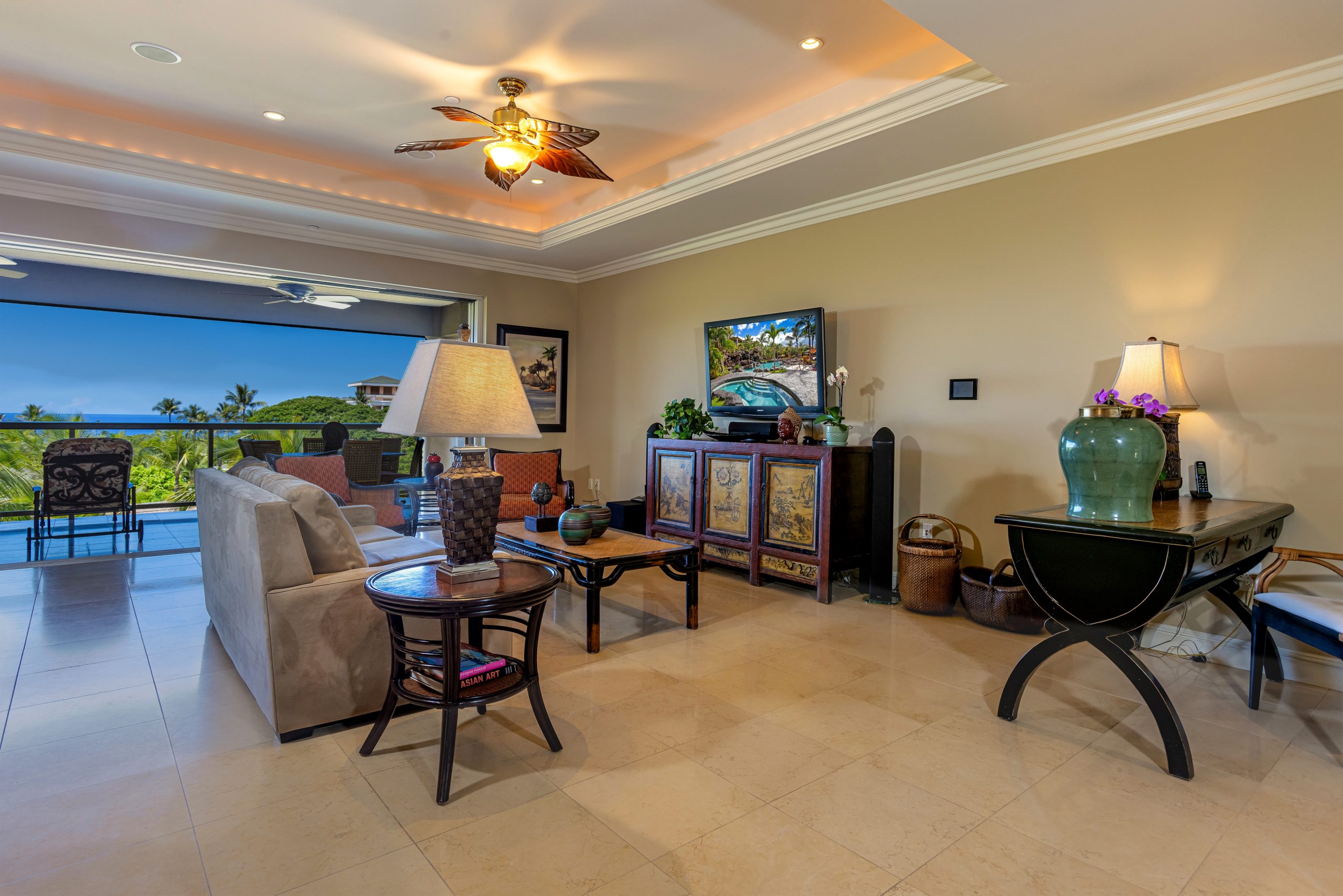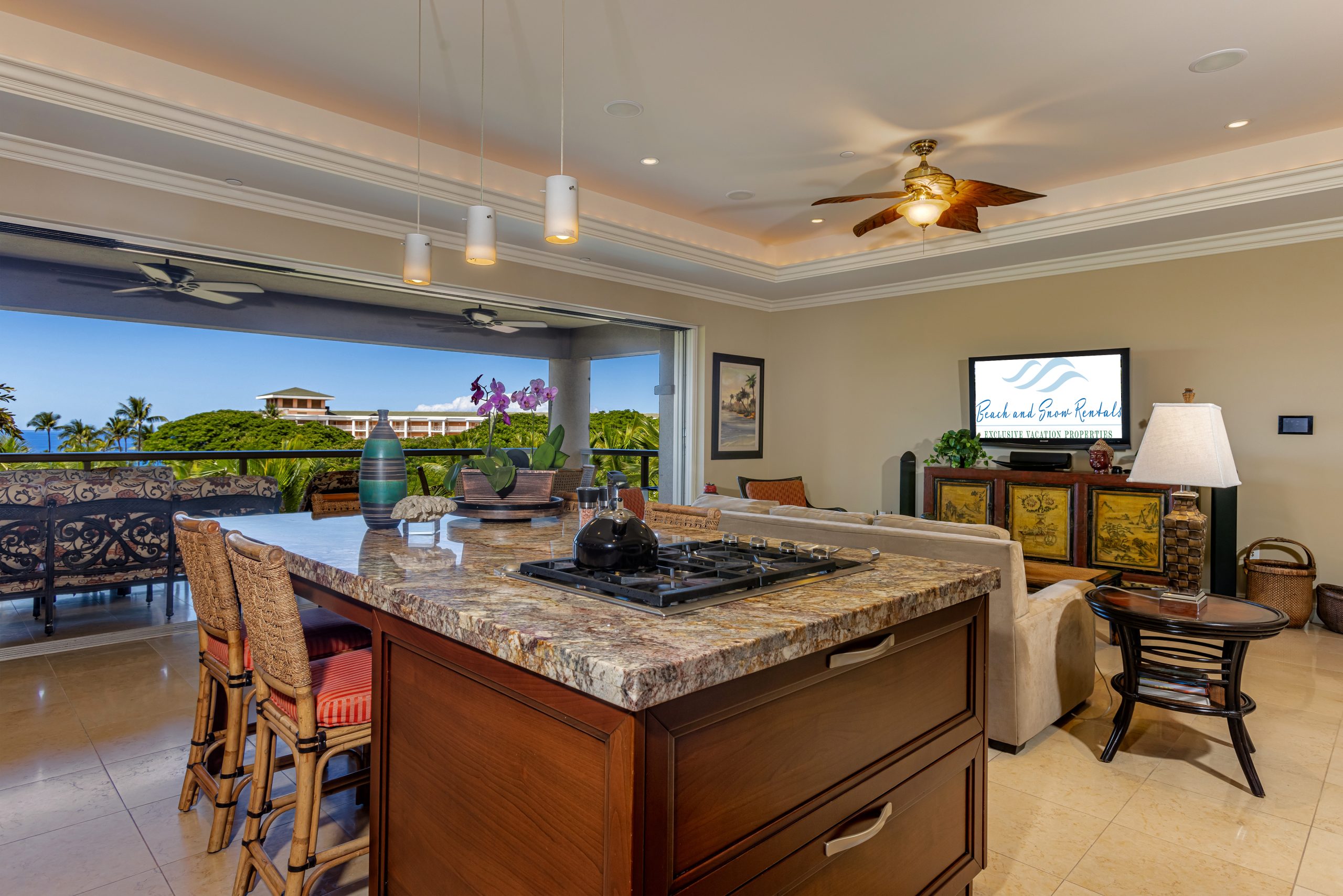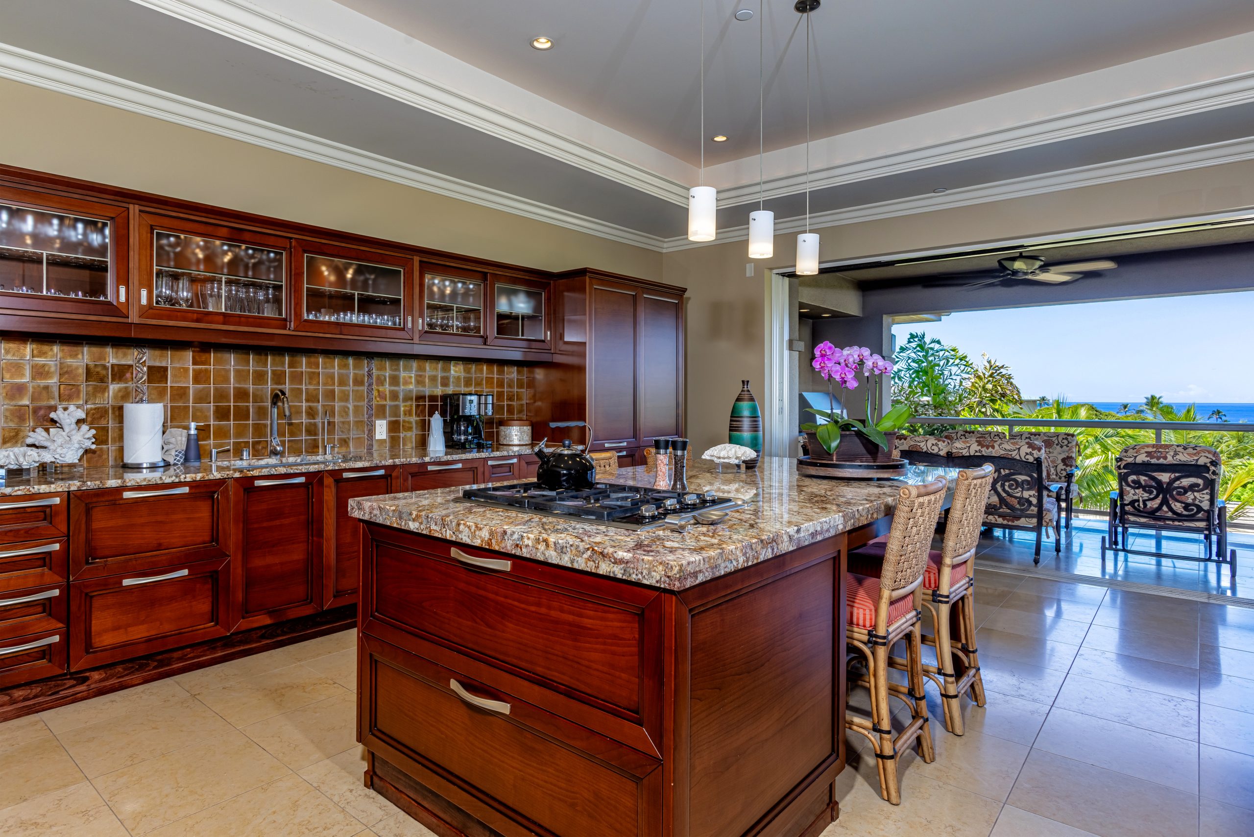 Enjoy spectacular ocean views and whale watching from inside the Ho’olei Wailea Beach Villa, or outside on either of our spacious covered lanais. No residential rooftops will interfere with your views of the ocean. Ho’olei Wailea Beach Villa’s upper lanai contains a BBQ area with a Wolf 36′ Grill, Sub-Zero under-counter refrigerator and custom cabinetry. Floor to ceiling sliding glass doors retract into hidden pockets, thereby blending the interior space with the beauty of the outdoors.